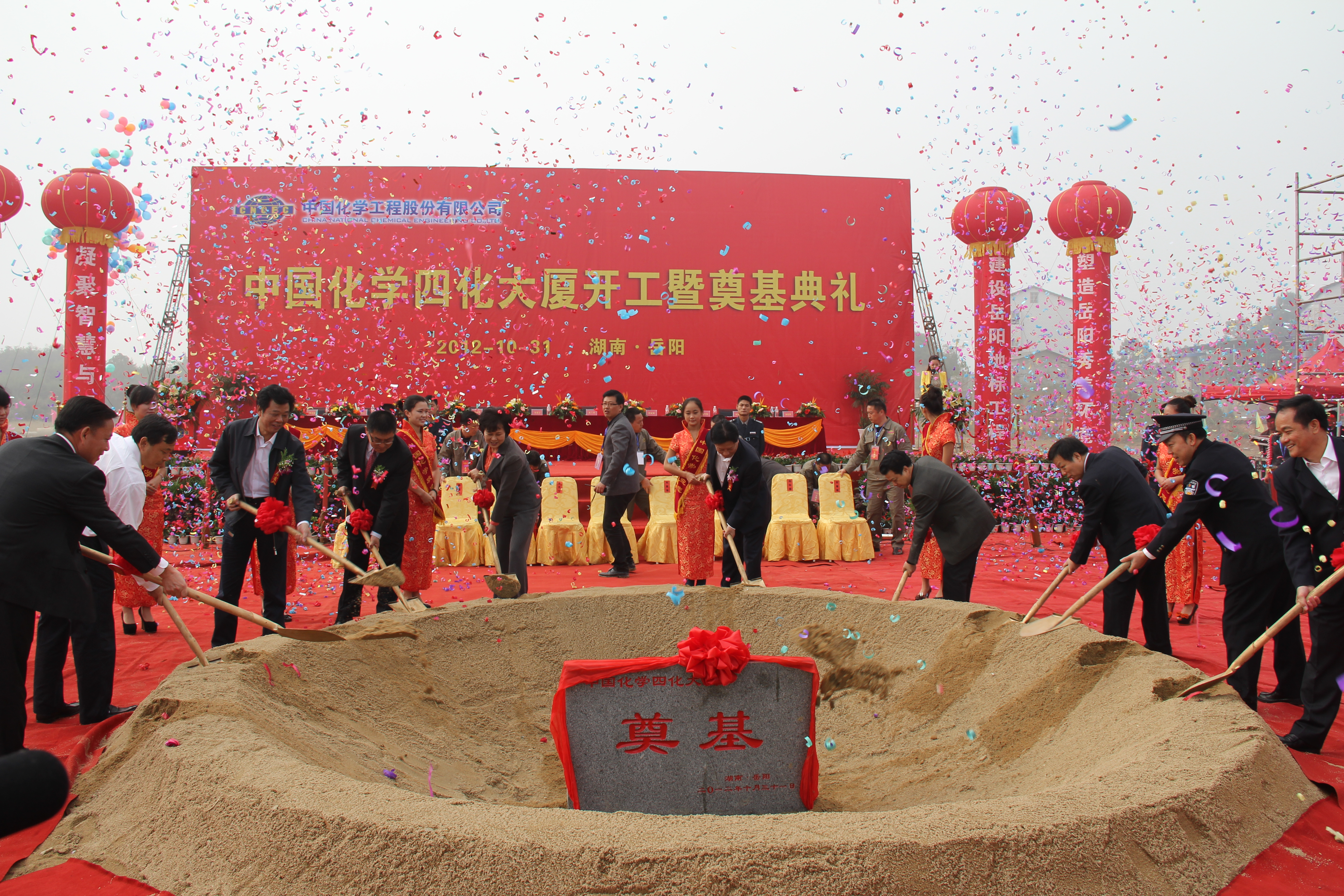 中國化學(xué)工程集團(tuán)公司黨委書記、總經(jīng)理、中國化學(xué)工程股份有限公司黨委書記、董事長金克寧出席儀式。岳陽市委書記黃蘭香宣布“中國化學(xué)四化大廈開工”。岳陽市委副書記、市長盛榮華,中國化學(xué)工程股份有限公司黨委常委、副總經(jīng)理劉家強(qiáng),岳陽市經(jīng)濟(jì)技術(shù)開發(fā)區(qū)工委書記胡知榮,公司黨委書記、董事長劉德輝等先后在儀式上致辭。岳陽市委常委、市委秘書長樊進(jìn)軍,岳陽市委常委、副市長陳四海,岳陽市政府副廳級干部、市公安局局長丁陽云共同出席儀式,并為四化大廈鏟土奠基。開工奠基儀式由岳陽市經(jīng)濟(jì)技術(shù)開發(fā)區(qū)工委副書記、管委會主任劉美樹主持。