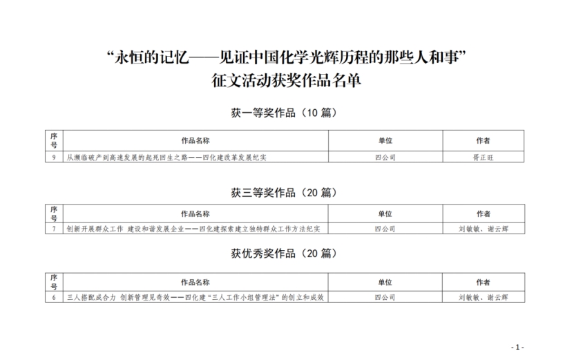 2020年3月以來,集團(tuán)公司組織開展了“永恒的記憶——見證中國化學(xué)光輝歷程的那些人和事”征文活動(dòng)。該活動(dòng)得到了公司職工的積極響應(yīng),共向集團(tuán)上報(bào)8篇征文作品。其中由公司工會(huì)主席胥正旺撰寫的征文《從瀕臨破產(chǎn)到高速發(fā)展的起死回生之路——四化建改革發(fā)展紀(jì)實(shí)》榮獲一等獎(jiǎng),由公司黨群工作部主任劉敏敏、《四化建簡報(bào)》執(zhí)行主編謝云輝共同撰寫的征文《創(chuàng)新開展群眾工作 建設(shè)和諧發(fā)展企業(yè)——四化建探索建立獨(dú)特群眾工作方法紀(jì)實(shí)》《三人搭配成合力 創(chuàng)新管理見奇效——四化建“三人工作小組管理法”的創(chuàng)立和成效》分別榮獲三等獎(jiǎng)和優(yōu)秀獎(jiǎng),并先后在中國化學(xué)微信公眾號(hào)和《中國化學(xué)報(bào)》刊登。