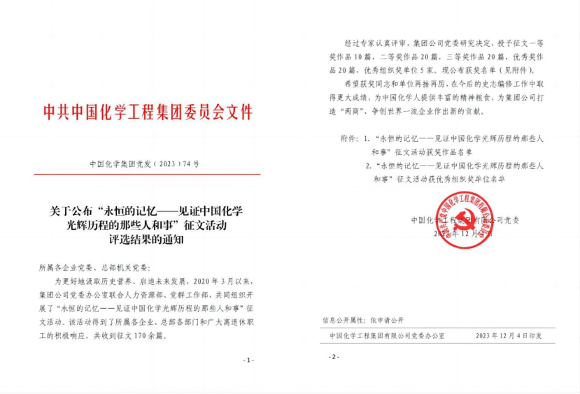 12月4日,中國化學(xué)工程集團(tuán)有限公司發(fā)文公布“永恒的記憶——見證中國化學(xué)光輝歷程的那些人和事”征文活動(dòng)評(píng)選結(jié)果,公司三篇作品分別榮獲一等獎(jiǎng)、三等獎(jiǎng)和優(yōu)秀獎(jiǎng)。
