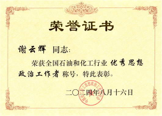 謝云輝獲評(píng)全國(guó)石油和化學(xué)工業(yè)優(yōu)秀思想政治工作者