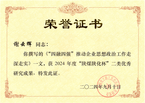 謝云輝撰寫(xiě)的政研論文獲評(píng)2024年度“陜煤陜化杯”二類(lèi)優(yōu)秀成果