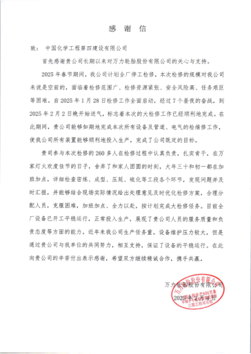 近日,華南公司從化萬力輪胎三期項(xiàng)目團(tuán)隊(duì)收到萬力輪胎股份有限公司發(fā)來的感謝信。信中高度贊揚(yáng)公司項(xiàng)目團(tuán)隊(duì)在2025年春節(jié)期間高效完成全廠停工大檢修任務(wù),以專業(yè)能力和責(zé)任擔(dān)當(dāng)助力業(yè)主實(shí)現(xiàn)“開門穩(wěn)、開門紅”。