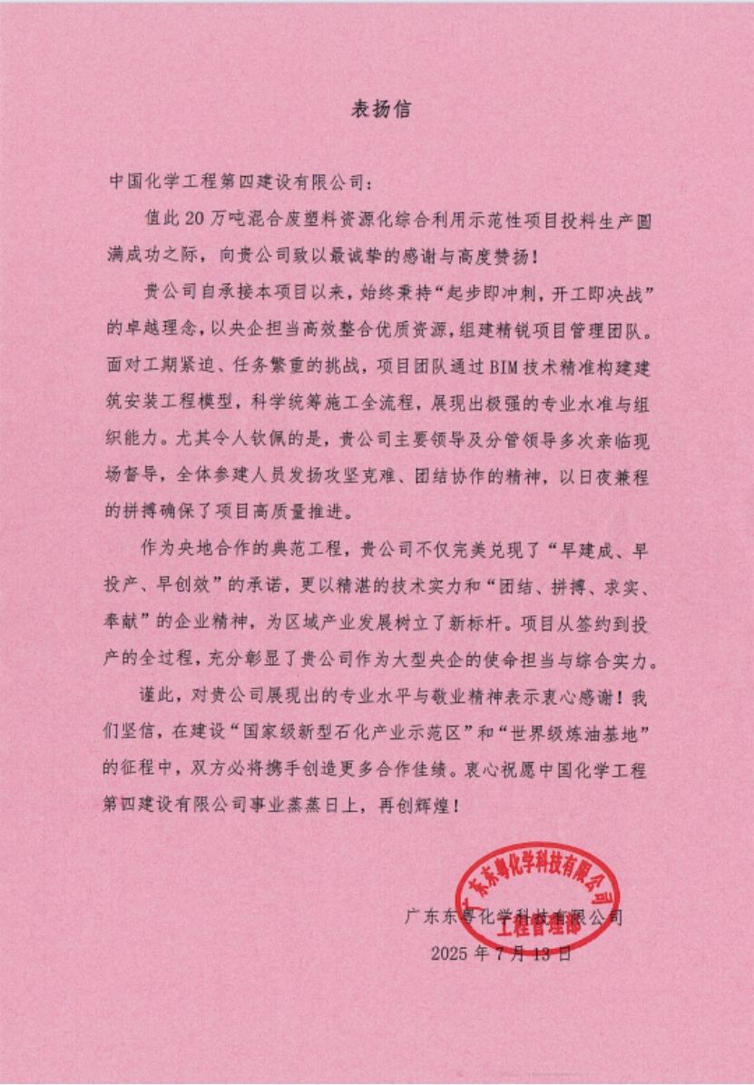 近日,中國化學(xué)四化建被廣東東粵化學(xué)科技有限公司授予“優(yōu)秀承包商”稱號,并收到其發(fā)來的表揚信,對公司承建東粵化學(xué)20萬噸/年混合廢塑料資源化綜合利用示范性項目期間展現(xiàn)的專業(yè)實力、央企擔(dān)當(dāng)與拼搏精神給予高度評價,盛贊雙方是合作共贏的典范。