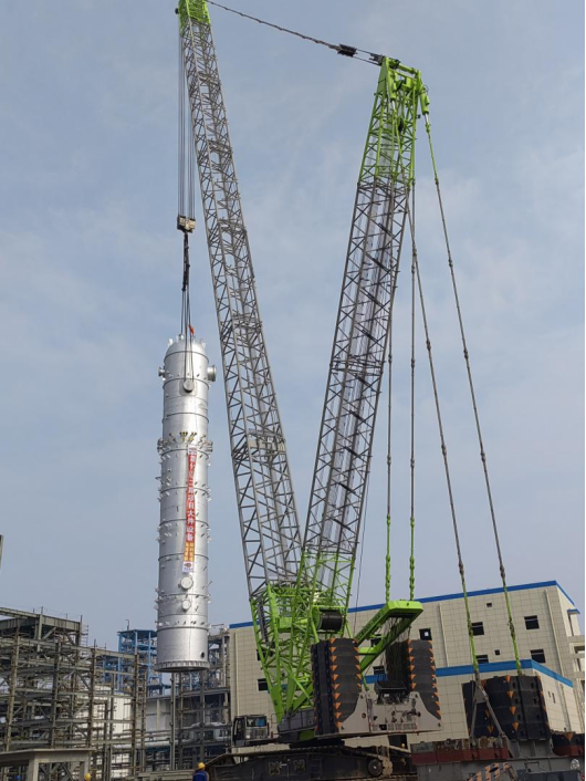 該氧氯化反應(yīng)器自重257.2噸,是項(xiàng)目裝置的關(guān)鍵設(shè)備。為確保安全優(yōu)質(zhì)高效完成氧氯化反應(yīng)器吊裝,項(xiàng)目部克服設(shè)備進(jìn)場(chǎng)路線難、設(shè)備滯后等多種不利因素的影響,多次組織召開施工協(xié)調(diào)會(huì),根據(jù)現(xiàn)場(chǎng)實(shí)際情況制定周密吊裝方案,并在吊裝前對(duì)參與吊裝的人員進(jìn)行了安全技術(shù)交底。吊裝現(xiàn)場(chǎng)采用800噸履帶吊、600噸汽車吊溜尾遞送吊裝。經(jīng)過吊裝人員通力合作,氧氯化反應(yīng)器平穩(wěn)起升、扳起、回轉(zhuǎn)、就位,一次順利完成吊裝。