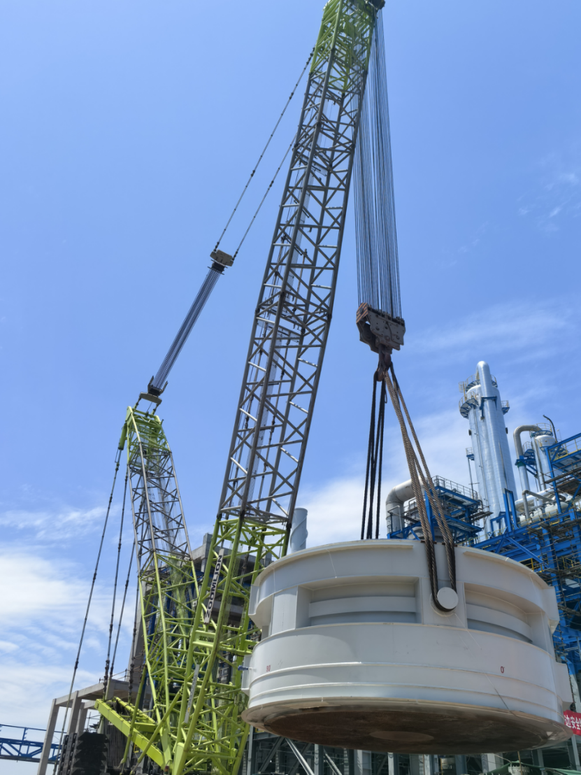 公司衛(wèi)星石化項(xiàng)目兩臺(tái)超800噸大型反應(yīng)器吊裝就位